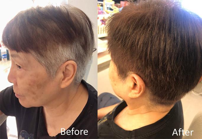 同樣的上色過程,染完之後,一頭灰白的頭發瞬間變的烏黑。