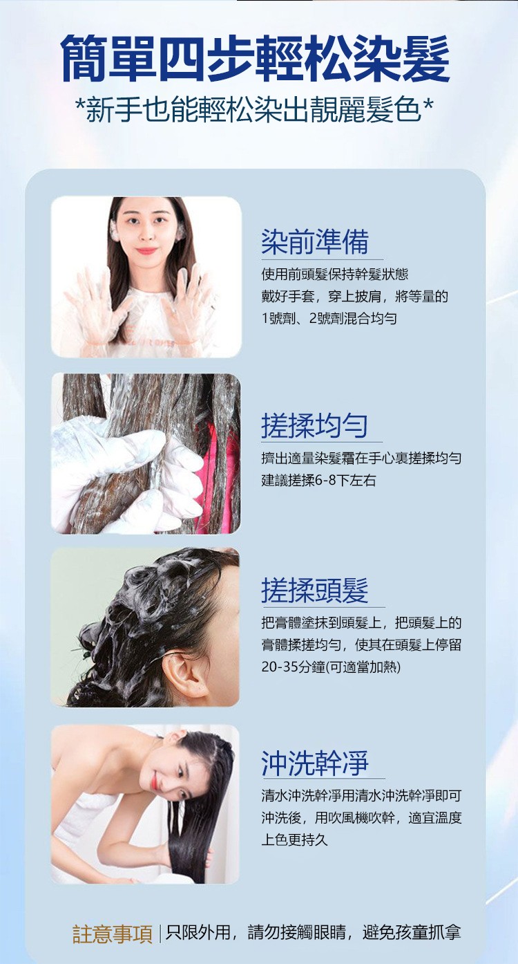 像洗頭一樣,將泡泡全部揉搓進頭發裏,確保每一根發絲都上色,自己在家對著鏡子也能輕松操作!